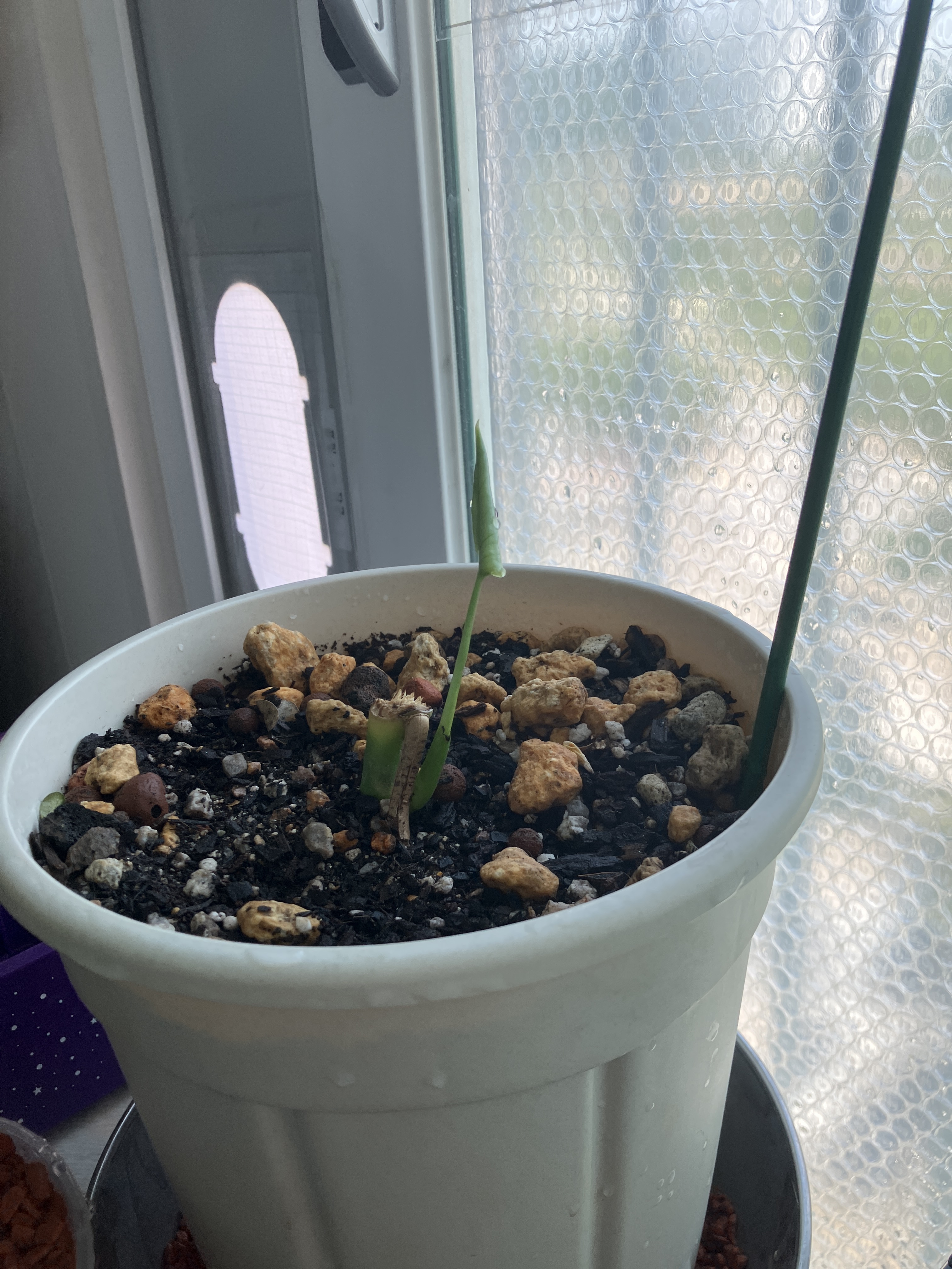 새촉 올라오기 전에 집으로 들였다가 잎이 네 개째 올라올 때 다시 데리고 왔어요.